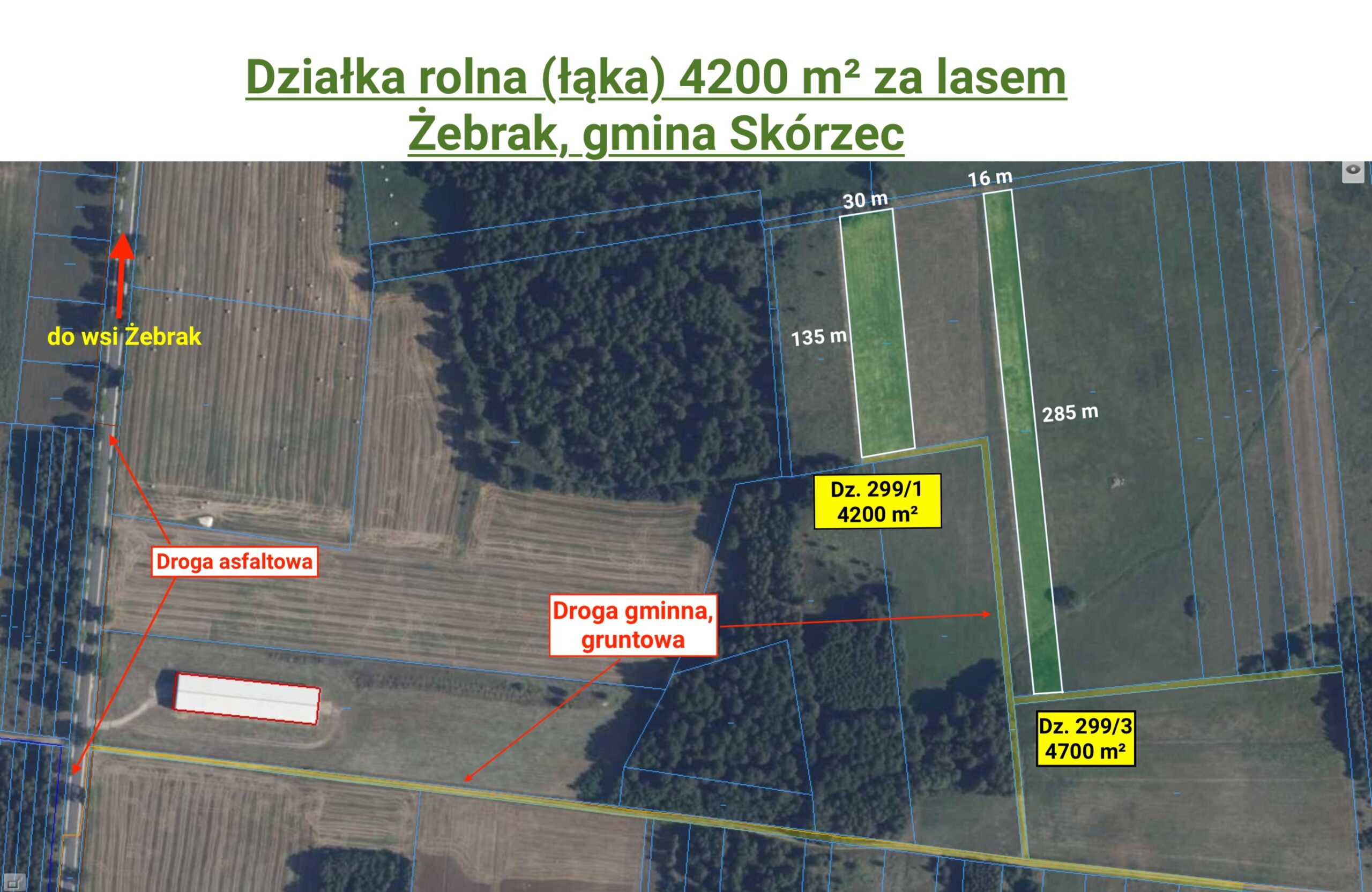 Mamy do zaoferowania Państwu nieruchomość rolną (łąka) o powierzchni 4200 m² położoną w pobliżu miejscowości Żebrak, gmina Skórzec, powiat siedlecki. Działka posiada numer ewidencyjny 299/1, obręb geodezyjny Żebrak. Nieruchomość położona jest w terenie łąk i pól w bezpośrednim sąsiedztwie niewielkiego lasu, około 1000 metrów od najbliższych zabudowań wsi. Powierzchnia działki jest płaska. Dojazd drogą gruntową w dobrym stanie – 800 metrów od drogi asfaltowej. Działka w użytkowaniu rolniczym – możliwość uzyskiwania dopłat bezpośrednich.